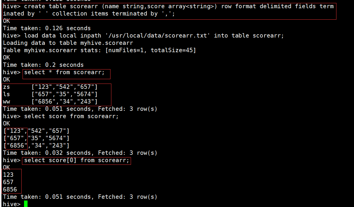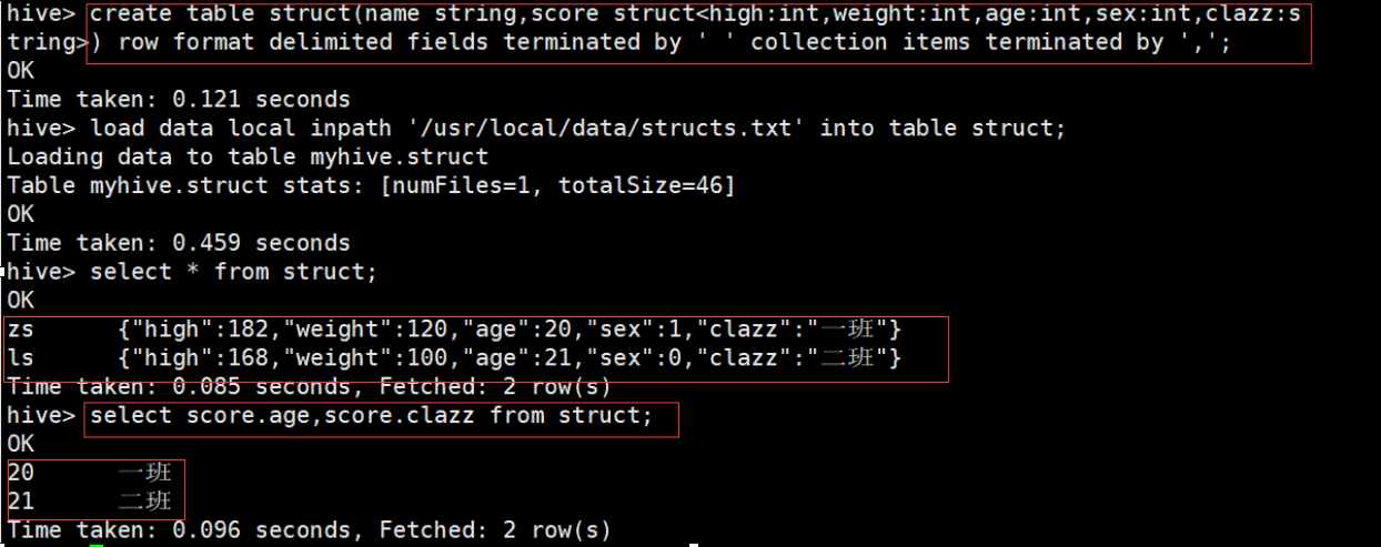 hive> create table struct(name string,score struct<high:int,weight:int,age:int,sex:int,clazz:string>) row format delimited fields terminated by ' ' collection items terminated by ',';