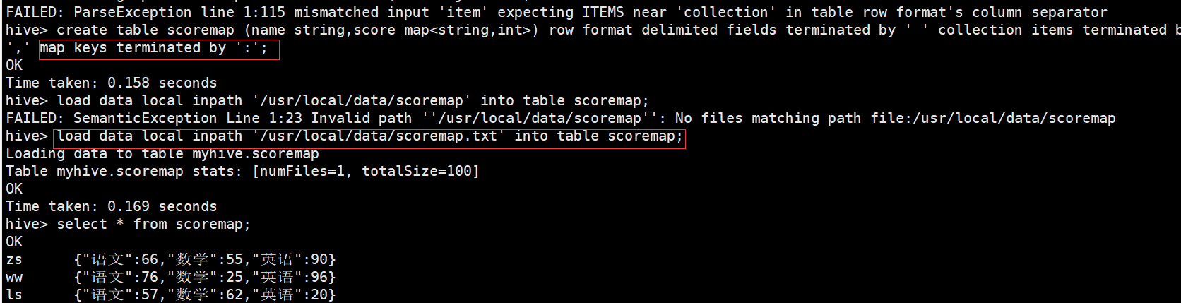 create table scoremap (name string,score map<string,int>) row format delimited fields terminated by ' ' collection items terminated by ',' map keys terminated by ':';