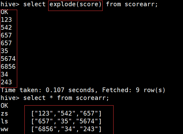 hive> select explode(score) from scorearr; //复杂数据扁平化,行转列,列转行