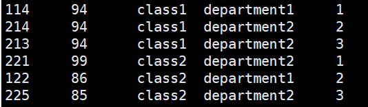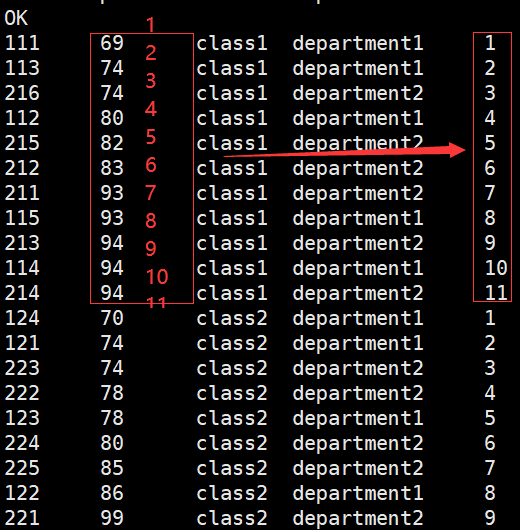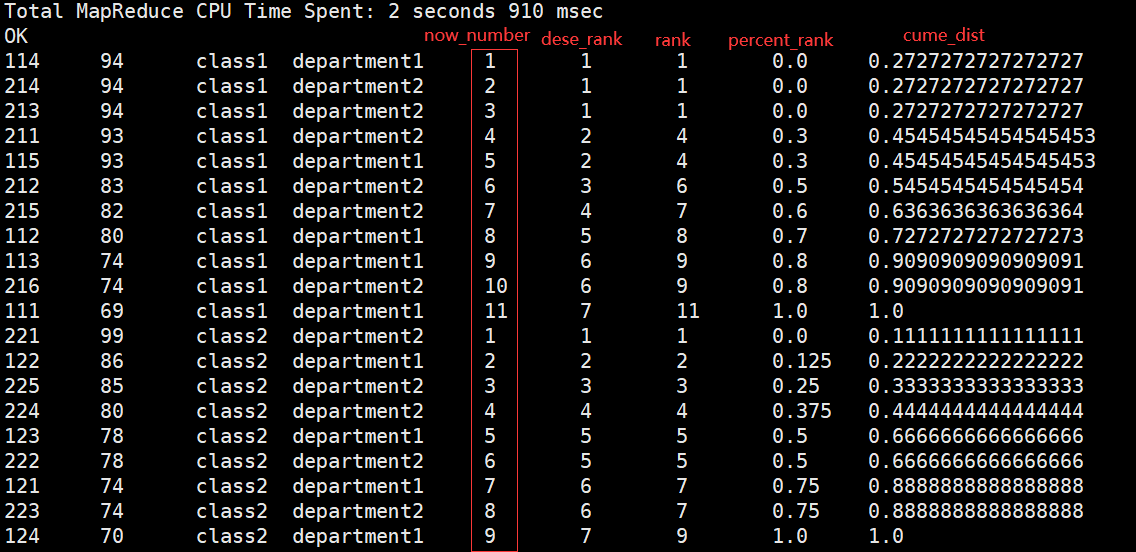 hive> select *,row_number() over (partition by clazz order by score desc),dense_rank() over (partition by clazz order by score desc),rank() over (partition by clazz order by score desc),percent_rank() over (partition by clazz order by score desc),cume_dist() over (partition by clazz order by score desc) from new_score;