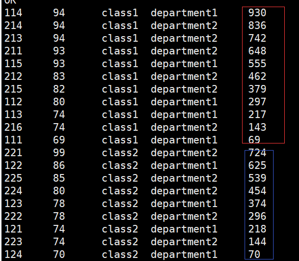 hive> select *,sum(score) over (partition by clazz order by score desc rows between current row and unbounded following) from new_score;