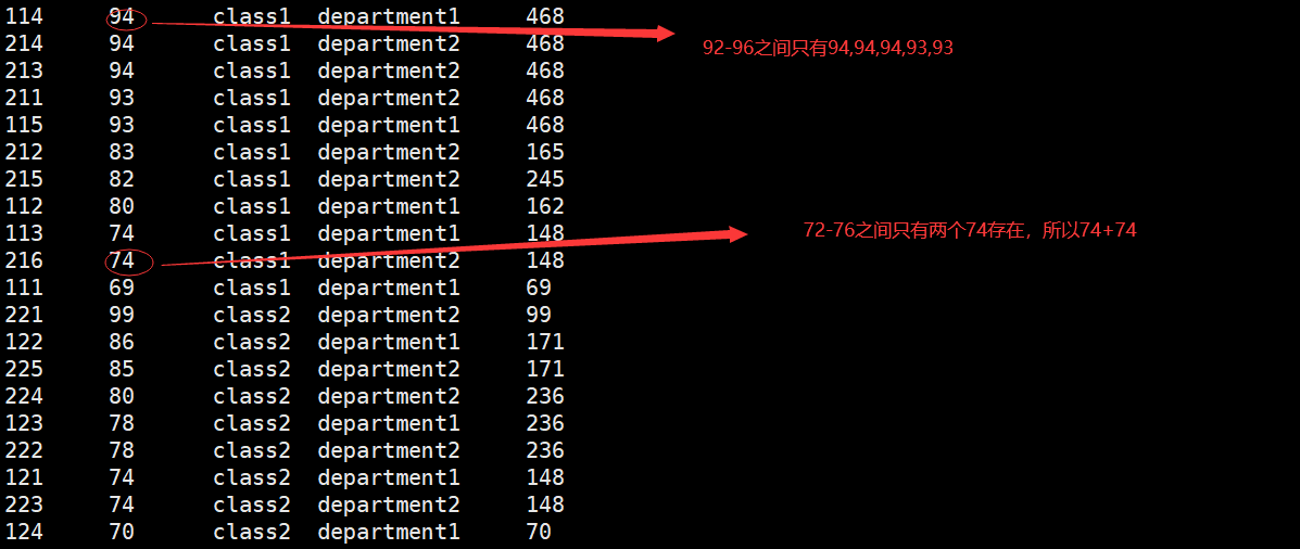 hive> select *,sum(score) over (partition by clazz order by score desc range between 2 preceding and 2 following) from new_score;