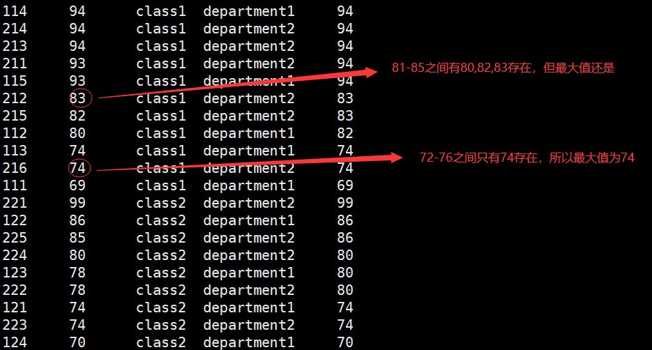 max(score) over (partition by clazz order by score desc range between 2 PRECEDING and 2 FOLLOWING)