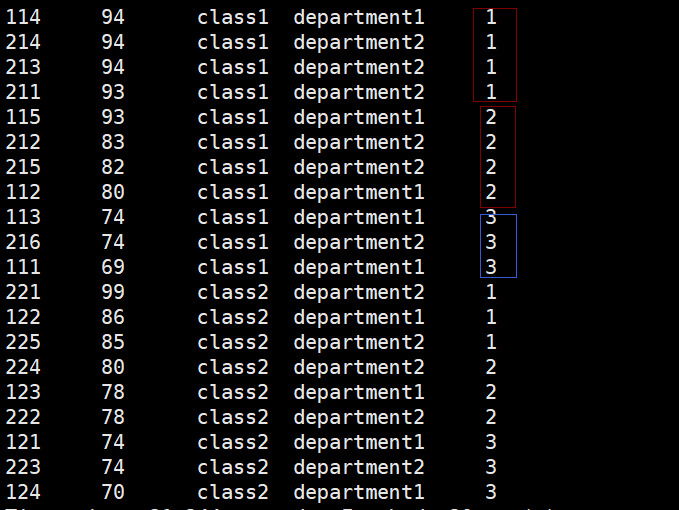 hive> select a.* from (select *,row_number() over (partition by clazz order by score desc) as num from new_score) a where a.num<=3;