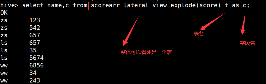 hive> select name,c from scorearr lateral view explode(score) t as c; (list集合)
