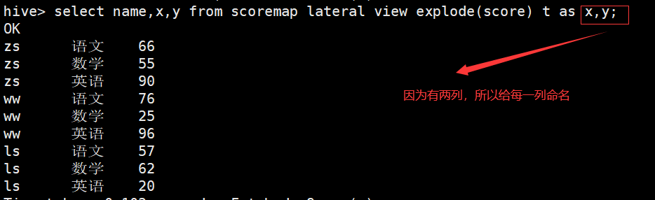 hive> select name,x,y from scoremap lateral view explode(score) t as x,y; (map集合)