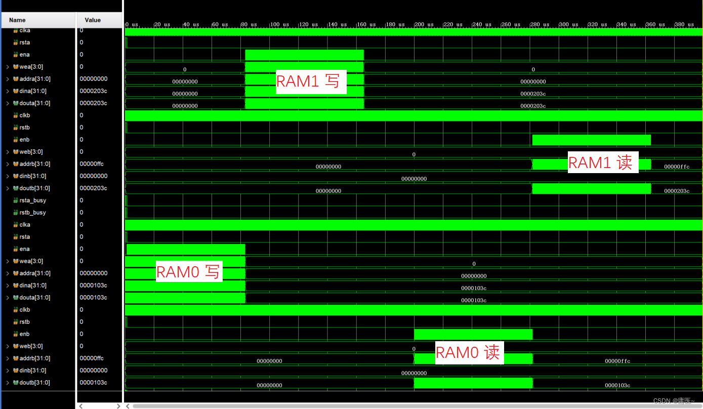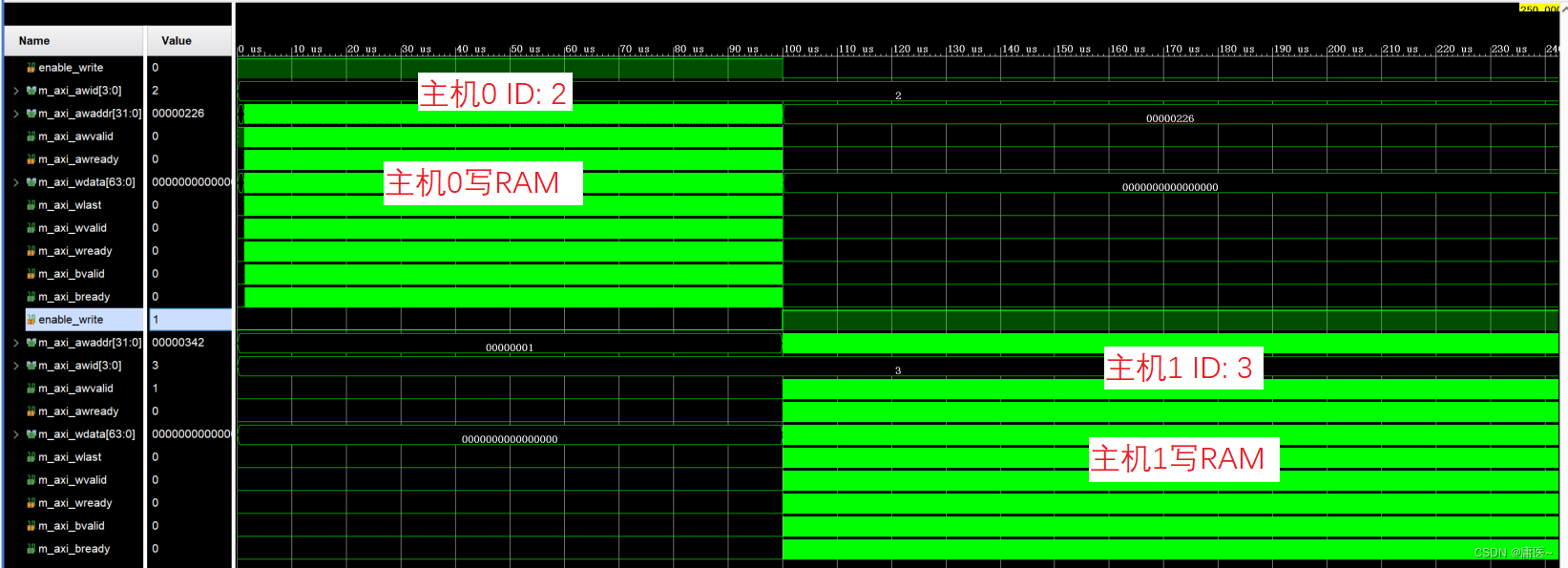 对其进行仿真,对两个BRAM所占的地址空间进行连续写,写完之后进行连续读。可以看到实现了一个主机控制两个从机。