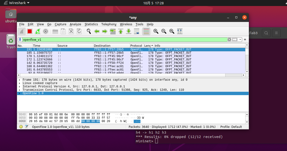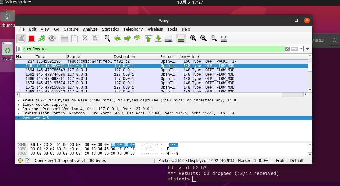 - 能够运用 wireshark 对 OpenFlow 协议数据交互过程进行抓包;