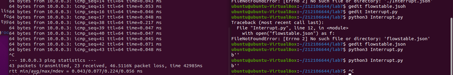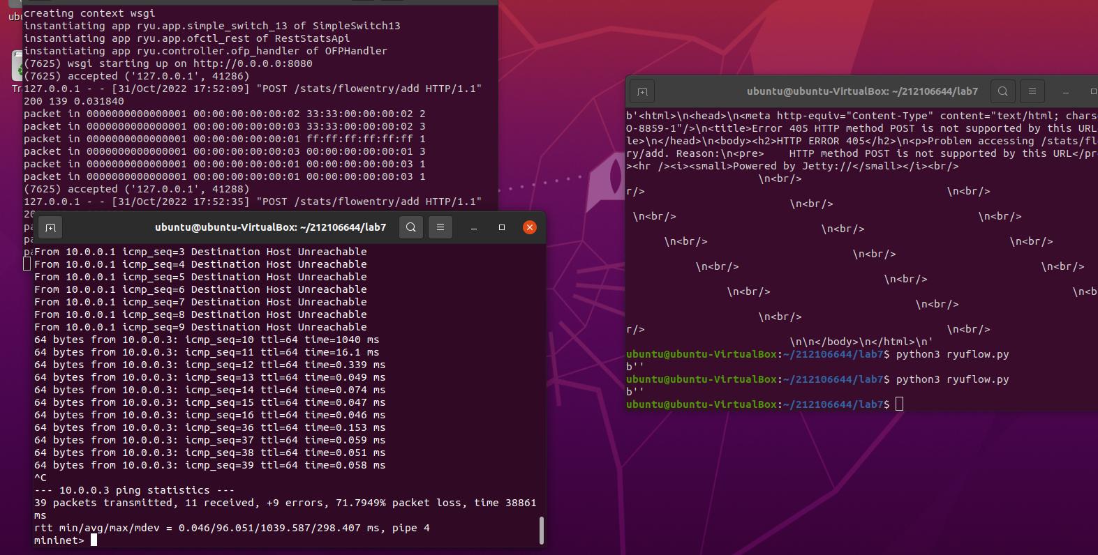 遇到的问题以及解决办法:在做odl的时候,由于以前一直没有更改默认的python版本号,以前使用的python命令是python3,但是这次做的时候忘记了,导致一直使用python,打开python文件,结果一直错误,但是之后改用了python3 的打开方式之后,解决问题。还有就是在ryu控制器的时候,打开控制器后创建了拓扑但是无法ping通,之后我删除了mininet的缓存,重新启动虚拟机,再打开ryu控制器,结果一切顺利