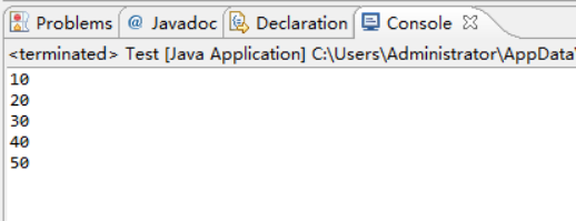 package aa; public class Test { /** * @param args */ public static void main(String[] args) { // TODO Auto-generated method stub int a[] = { 10, 20, 30, 40, 50 }; for (int i = 0; i < a.length; i++) { System.out.println(a[i]); } } }