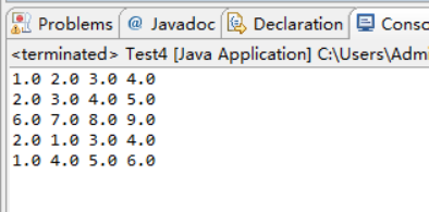 package aa; public class Test4 { /** * @param args */ public static void main(String[] args) { // TODO Auto-generated method stub double a[][]={{1,2,3,4,},{2,3,4,5},{6,7,8,9},{2,1,3,4},{1,4,5,6}}; for (int i = 0; i < a.length; i++) { for (int j = 0; j < a[0].length; j++) { System.out.print(a[i][j]+" "); } System.out.println(); } } }