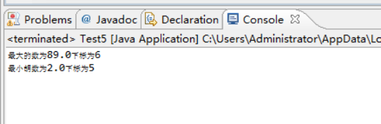 package aa; public class Test5 { /** * @param args */ public static void main(String[] args) { // TODO Auto-generated method stub double a[] ={18,25,7,36,13,2,89}; double max = a[0]; int maxxb = 0; double min = a[0]; int minxb = 0; for (int i = 0; i < a.length; i++) { if (a[i] > max) { max = a[i]; maxxb = i; } if (a[i] < min) { min = a[i]; minxb = i; } } System.out.println("最大的数为"+max+"下标为"+maxxb); System.out.println("最小胡数为"+min+"下标为"+minxb); } }