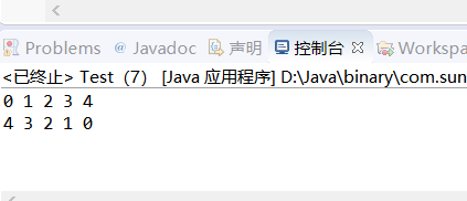 package diqizhou; public class Test { public static void main(String[] args) { // TODO Auto-generated method stub int a[] = new int[5]; for (int i = 0; i < a.length; i++) { a[i] = i; } for (int i : a) { System.out.print(i + " "); } System.out.println(); for (int i = 0; i < a.length; i++) { for (int j = i; j < a.length; j++) { int temp = a[i]; a[i] = a[j]; a[j] = temp; } } for (int i : a) { System.out.print(i + " "); } } }
