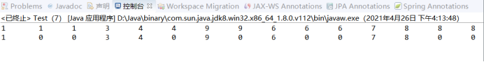 package diqizhou; public class Test { public static void main(String[] args) { // TODO Auto-generated method stub int[] a ={1,1,1,3,4,4,9,9,6,6,6,7,8,8,8,4,1}; for (int i : a) { System.out.print(i+"\t "); } System.out.println(); for (int i = 0; i < a.length; i++) { for (int j = i+1; j < a.length; j++) { if (a[i] == a[j]) a[j] =0; } } for (int i : a) { System.out.print(i+"\t "); } } }
