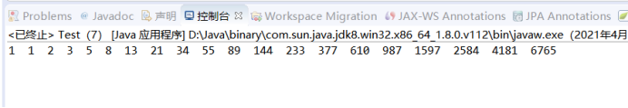 package diqizhou; public class Test { public static void main(String[] args) { // TODO Auto-generated method stub int a[] =new int [20]; a[0] = 1; a[1] = 1; for (int i = 2; i < a.length; i++) { a[i] =a[i-1] +a[i-2]; } for (int i : a) { System.out.print(i +" "); } } }