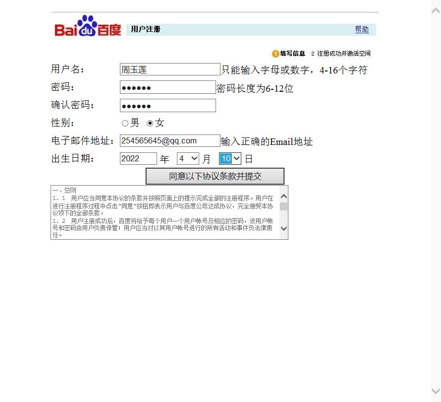 1 <%@ page language="java" import="java.util.*" pageEncoding="UTF-8"%> 2 3 <!DOCTYPE HTML PUBLIC "-//W3C//Dtd HTML 4.01 transitional//EN"> 4 <html> 5 <head> 6 <title>用户注册</title> 7 </head> 8 <body> 9 <form action="Text_1.jsp" method="post" name="myform"> 10 <table border="0" cellpadding="0" cellspacing="0" align="center" > 11 <tr> 12 <td height="18" colspan="2"><img src="baidu.jpg"></td> 13 </tr> 14 <tr> 15 <td height="36" width="100">用户名:</td> 16 <td width="524"><input name="txtUser" type="text" 17 maxlength="16">只能输入字母或数字,4-16个字符</td> 18 </tr> 19 <tr> 20 <td height="36" width="100">密码:</td> 21 <td width="524"><input name="txtPass" type="password">密码长度为6-12位</td> 22 </tr> 23 <tr> 24 <td height="36" width="100">确认密码:</td> 25 <td width="524"><input name="txtrPass" type="password"> 26 </td> 27 </tr> 28 <tr> 29 <td height="36" width="100">性别:</td> 30 <td width="524"><input name="gen" type="radio" value="男" checked="checked">男 31 <input name="gen" type="radio" value="女" class="input">女 </td> 32 </tr> 33 <tr> 34 <td height="36" width="140">电子邮件地址:</td> 35 <td width="524"><input name="txtEmail" type="text">输入正确的Email地址</td> 36 </tr> 37 <tr> 38 <td height="36" width="100">出生日期:</td> 39 <td width="524"><input name="year" id="year" size="4" value="2000" 40 maxlength="4"> 年 <select name="month"> 41 <option value=1>1</option> 42 <option value=2>2</option> 43 <option value=3>3</option> 44 <option value=4>4</option> 45 <option value=5>5</option> 46 <option value=6>6</option> 47 <option value=7>7</option> 48 <option value=8>8</option> 49 <option value=9>9</option> 50 <option value=10>10</option> 51 <option value=11>11</option> 52 <option value=12>12</option> 53 </select> 月 <select name="day"> 54 <option value=1>1</option> 55 <option value=2>2</option> 56 <option value=3>3</option> 57 <option value=4>4</option> 58 <option value=5>5</option> 59 <option value=6>6</option> 60 <option value=7>7</option> 61 <option value=8>8</option> 62 <option value=9>9</option> 63 <option value=10>10</option> 64 <option value=11>11</option> 65 <option value=12>12</option> 66 <option value=13>13</option> 67 <option value=14>14</option> 68 <option value=15>15</option> 69 <option value=16>16</option> 70 <option value=17>17</option> 71 <option value=18>18</option> 72 <option value=19>19</option> 73 <option value=20>20</option> 74 <option value=21>21</option> 75 <option value=22>22</option> 76 <option value=23>23</option> 77 <option value=24>24</option> 78 <option value=25>25</option> 79 <option value=26>26</option> 80 <option value=27>27</option> 81 <option value=28>28</option> 82 <option value=29>29</option> 83 <option value=30>30</option> 84 <option value=31>31</option> 85 </select> 日</td> 86 </tr> 87 <tr> 88 <td colspan="2" align="center"><input type="submit" 89 value="同意以下协议条款并提交"></td> 90 </tr> 91 <tr> 92 <td colspan="2"><textarea cols="" rows="" readonly="readonly" 93 style="width:480px;height:110px;font-size:12px;color:#666"> 94 一、总则 95 1.1 用户应当同意本协议的条款并按照页面上的提示完成全部的注册程序。用户在进行注册程序过程中点击"同意"按钮即表示用户与百度公司达成协议,完全接受本协议项下的全部条款。 96 1.2 用户注册成功后,百度将给予每个用户一个用户帐号及相应的密码,该用户帐号和密码由用户负责保管;用户应当对以其用户帐号进行的所有活动和事件负法律责任。 97 1.3 用户可以使用百度各个频道单项服务,当用户使用百度各单项服务时,用户的使用行为视为其对该单项服务的服务条款以及百度在该单项服务中发出的各类公告的同意。 98 1.4 百度会员服务协议以及各个频道单项服务条款和公告可由百度公司随时更新,且无需另行通知。您在使用相关服务时,应关注并遵守其所适用的相关条款。 99 您在使用百度提供的各项服务之前,应仔细阅读本服务协议。如您不同意本服务协议及/或随时对其的修改,您可以主动取消百度提供的服务;您一旦使用百度服务,即视为您已了解并完全同意本服务协议各项内容,包括百度对服务协议随时所做的任何修改,并成为百度用户。 100 </textarea> 101 </td> 102 </tr> 103 </table> 104 </form> 105 </body> 106 </html>