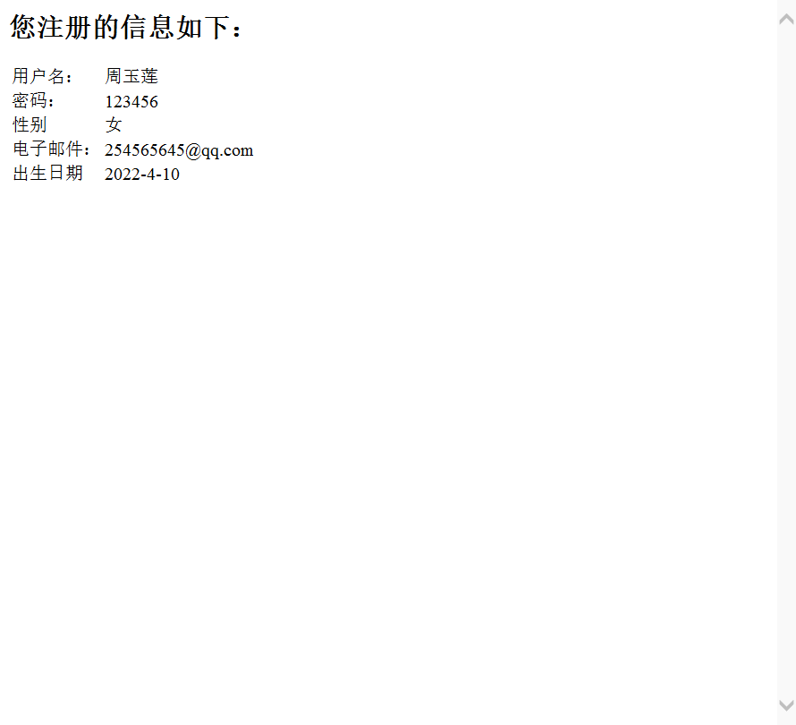 1 <%@ page language="java" import="java.util.*" pageEncoding="UTF-8"%> 2 3 <!DOCTYPE HTML PUBLIC "-//W3C//DTD HTML 4.01 Transitional//EN"> 4 <html> 5 <head> 6 <title>用户注册</title> 7 </head> 8 <body> 9 <h2>您注册的信息如下:</h2> 10 <% 11 request.setCharacterEncoding("utf-8"); 12 String name = request.getParameter("txtUser"); 13 String password = request.getParameter("txtPass"); 14 String gender = request.getParameter("gen"); 15 String email = request.getParameter("txtEmail"); 16 String year = request.getParameter("year"); 17 String month = request.getParameter("month"); 18 String day = request.getParameter("day"); 19 %> 20 <table> 21 <tr> 22 <td>用户名:</td><td><%=name %></td> 23 </tr> 24 <tr> 25 <td>密码:</td><td><%=password %></td> 26 </tr> 27 <tr> 28 <td>性别</td><td><%=gender %></td> 29 </tr> 30 <tr> 31 <td>电子邮件:</td><td><%=email %></td> 32 </tr> 33 <tr> 34 <td>出生日期</td><td><%=year %>-<%=month %>-<%=day %></td> 35 </tr> 36 </table> 37 </body> 38 </html>