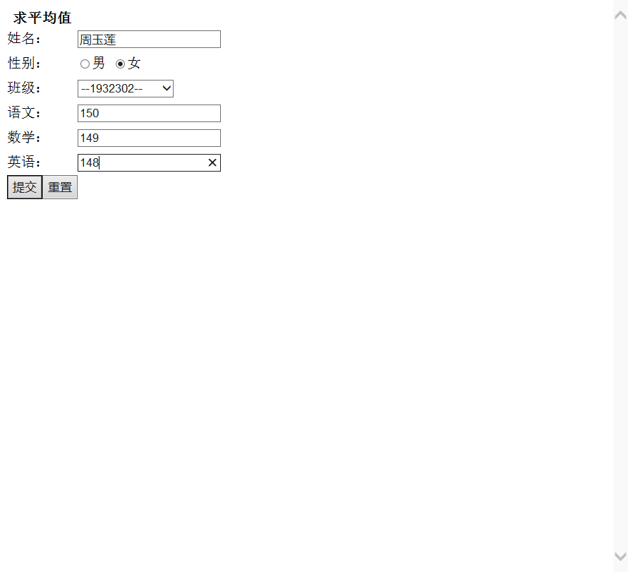 1 <%@ page language="java" import="java.util.*" pageEncoding="UTF-8"%> 2 3 <!DOCTYPE HTML PUBLIC "-//W3C//DTD HTML 4.01 Transitional//EN"> 4 <html> 5 <head> 6 <title>平均值</title> 7 </head> 8 <body> 9 <form action="show.jsp" method="post" name="myform"> 10 <table border="0" cellpadding="0" cellspacing="0"> 11 <tr> 12 <th>求平均值</th> 13 </tr> 14 <tr> 15 <td height="35">姓名:</td> 16 <td><input type="text" name="username" /> 17 </td> 18 </tr> 19 <tr> 20 <td height="35">性别:</td> 21 <td><input type="radio" name="gender" value="男" 22 checked="checked" />男 <input type="radio" name="gender" value="女" />女</td> 23 </tr> 24 <tr> 25 <td height="35">班级:</td> 26 <td><select name="team"> 27 <option value="0">--请选择班级--</option> 28 <option value="1932301">--1932301--</option> 29 <option value="1932302">--1932302--</option> 30 </select></td> 31 </tr> 32 <tr> 33 <td height="35">语文:</td> 34 <td><input type="text" name="yw" /> 35 </td> 36 </tr> 37 <tr> 38 <td height="35">数学:</td> 39 <td><input type="text" name="sx" /> 40 </td> 41 </tr> 42 <tr> 43 <td height="35">英语:</td> 44 <td><input type="text" name="yy" /> 45 </td> 46 </tr> 47 <tr> 48 <td><input type="submit" value="提交"><input type="reset" 49 value="重置" /> 50 </td> 51 </tr> 52 </table> 53 </form> 54 </body> 55 </html>