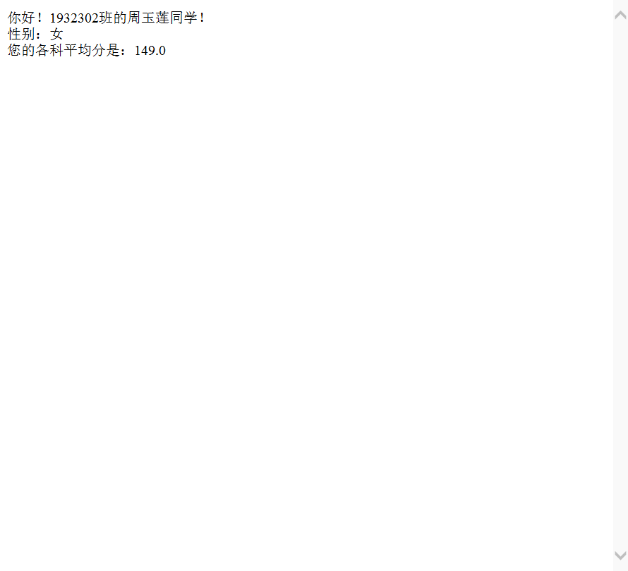 1 <%@ page language="java" import="java.util.*" pageEncoding="UTF-8"%> 2 3 <!DOCTYPE HTML PUBLIC "-//W3C//DTD HTML 4.01 Transitional//EN"> 4 <html> 5 <head> 6 <title>显示</title> 7 </head> 8 <body> 9 <% 10 request.setCharacterEncoding("utf-8"); 11 String name = request.getParameter("username"); 12 String gender = request.getParameter("gender"); 13 String team = request.getParameter("team"); 14 String yw = request.getParameter("yw"); 15 String sx = request.getParameter("sx"); 16 String yy = request.getParameter("yy"); 17 double a = yw == null ? 0 : Double.parseDouble(yw); 18 double b = sx == null ? 0 : Double.parseDouble(sx); 19 double c = yy == null ? 0 : Double.parseDouble(yy); 20 double avg = (a+b+c)/3; 21 %> 22 你好!<%=team %>班的<%=name %>同学!<br /> 23 性别:<%=gender %><br /> 24 您的各科平均分是:<%=avg %> 25 </body> 26 </html>