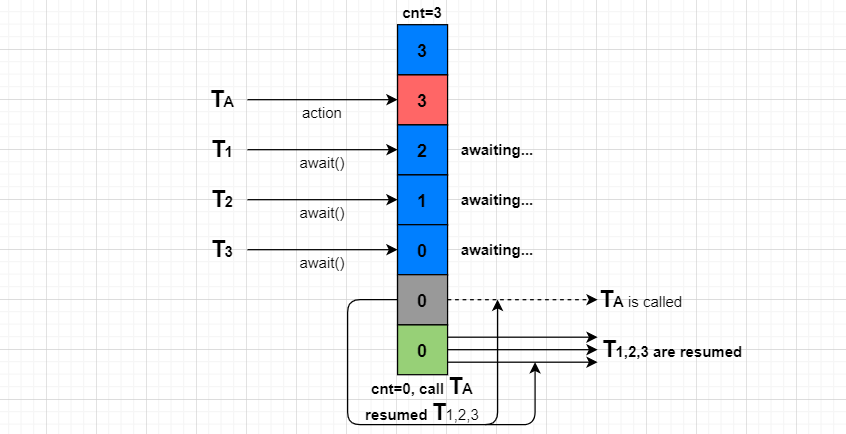 如果计数器值为0,线程进入休眠。当某个线程使用完共享资源后,释放信号量,并将信号量内部的计数器加1,之前进入休眠的线程将被唤醒并再次试图获得信号量。