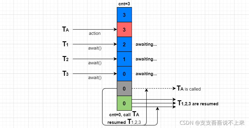 允许一组线程全部等待彼此达到共同屏障点的同步辅助类。这些线程必须相互等待彼此,每个线程都准备就绪后才能往下执行后续的操作。屏障被称为循环 ,因为它可以在等待的线程被释放之后重新使用。
