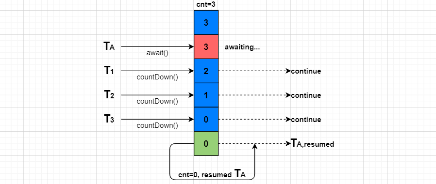 CountDownLatch是通过一个计数器来实现的,计数器的初始化值为线程的数量。每当一个线程完成了自己的任务后,计数器的值就相应得减1。当计数器到达0时,表示所有的线程都已完成任务,然后在闭锁上等待的线程就可以恢复执行任务。