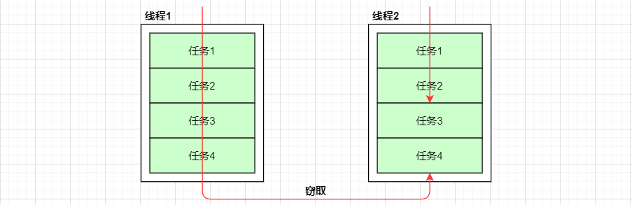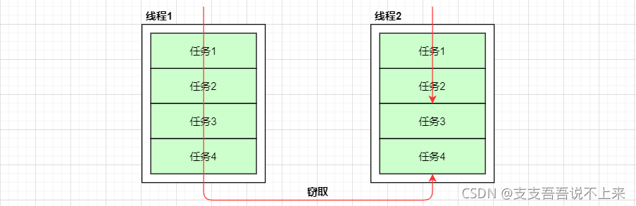 2.执行任务并合并结果:分割的子任务分别放到双端队列里,然后几个启动线程分别从双端队列里获取任务执行。子任务执行完的结果都放在另外一个队列里。