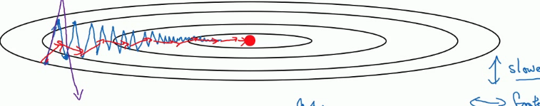 蓝色部分是正常的梯度下降,红色部分是增加了指数加权平均的梯度下降,增加了指数加权后会减少纵轴的上下摆动从而让横轴上更快的移动来达到增速的作用。