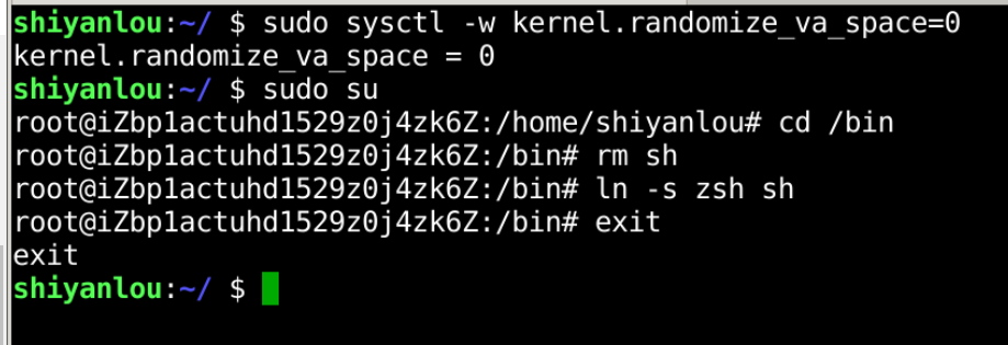 1.Ubuntu 和其他一些Linux系统中,使用地址空间随机化来随机堆(heap)和栈(stack)的初始地址,这使得猜测准确的内存地址变得十分困难,而猜测内存地址是缓冲区溢出关键。在实验中,我们需要命令行关闭这一功能。