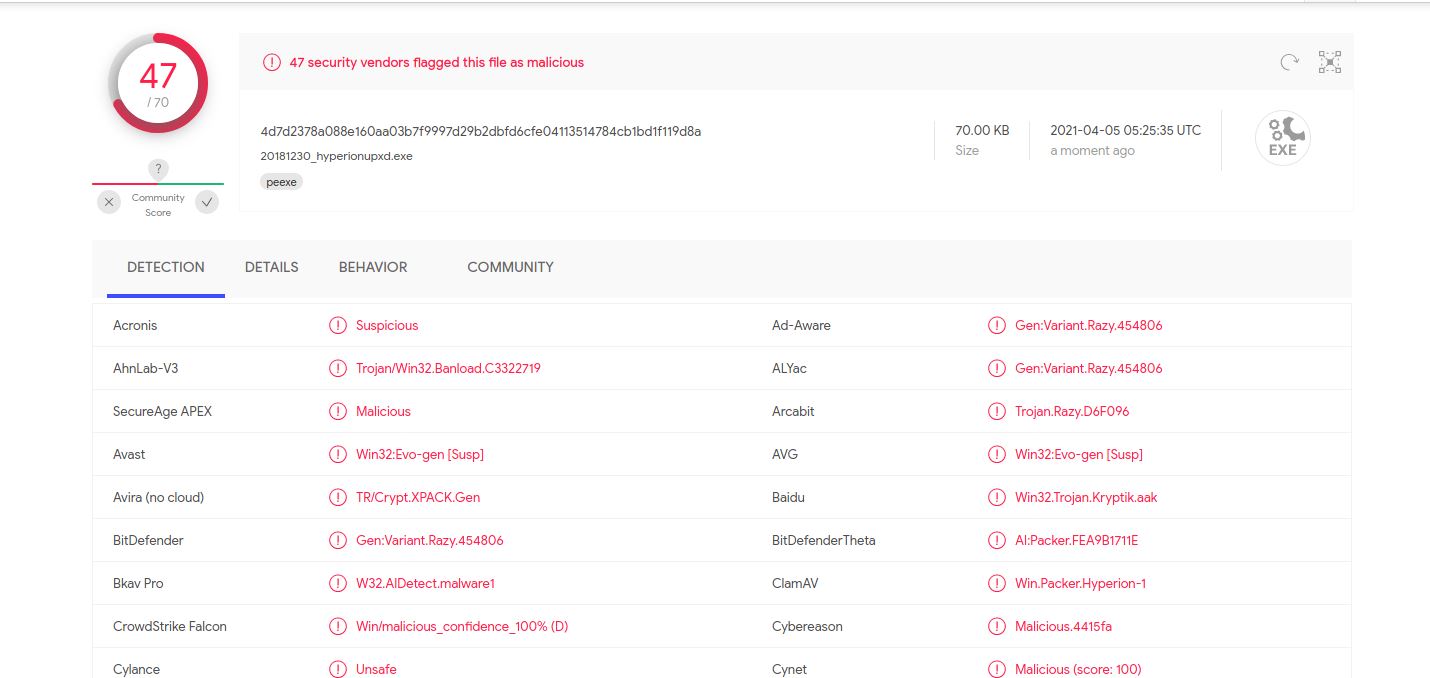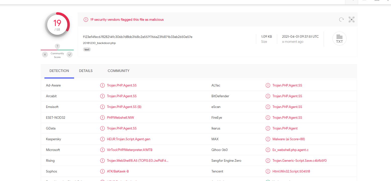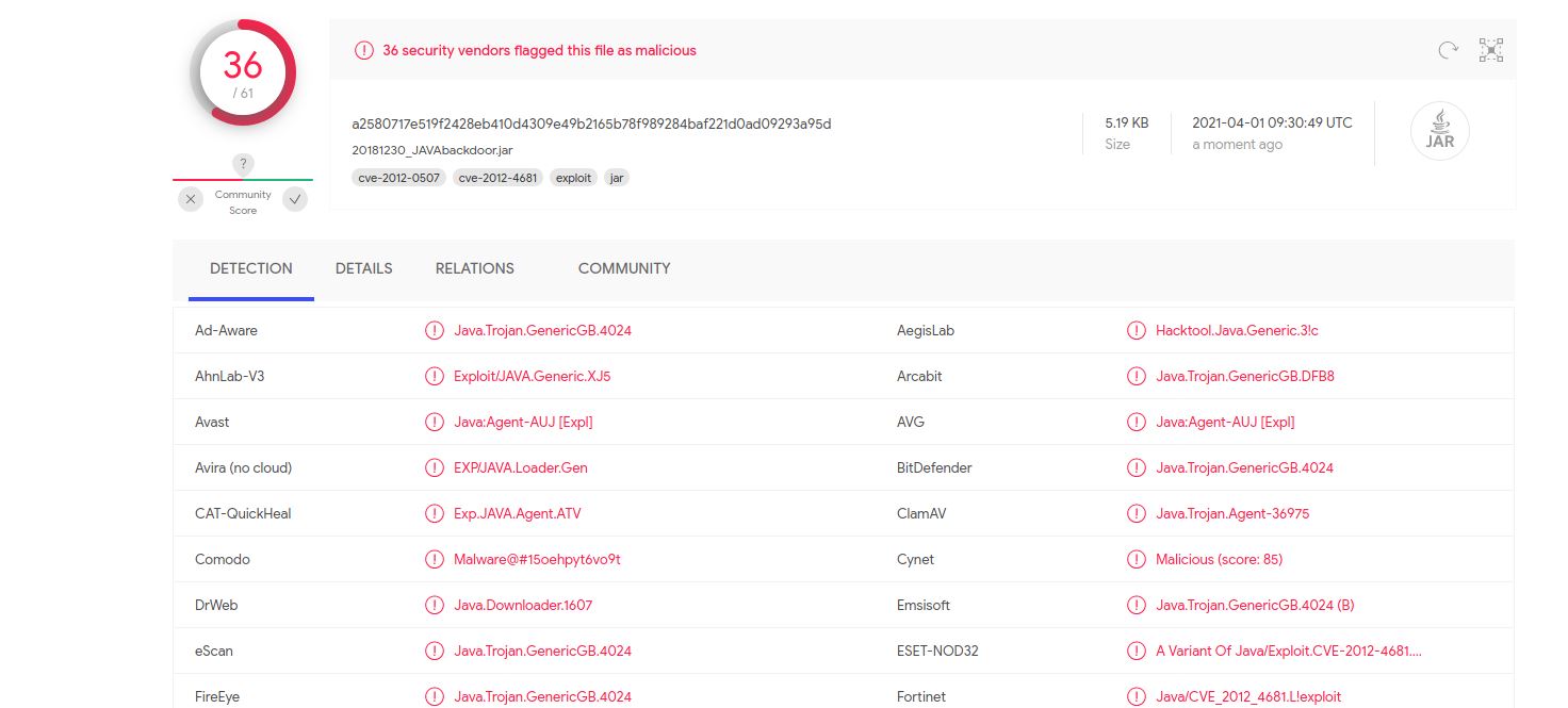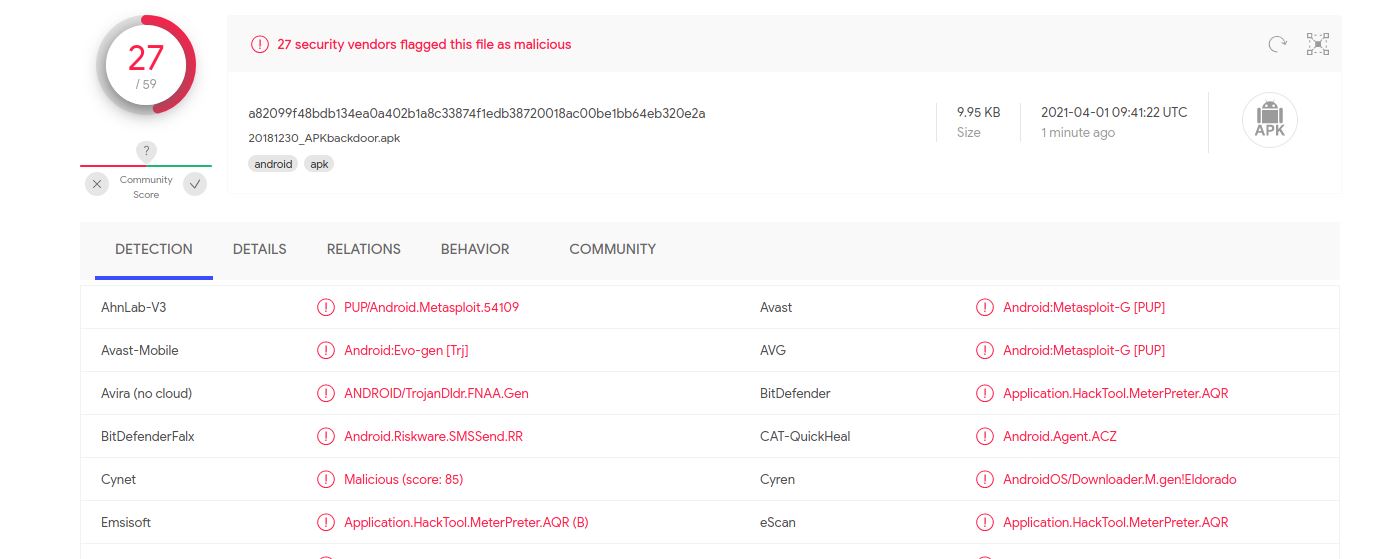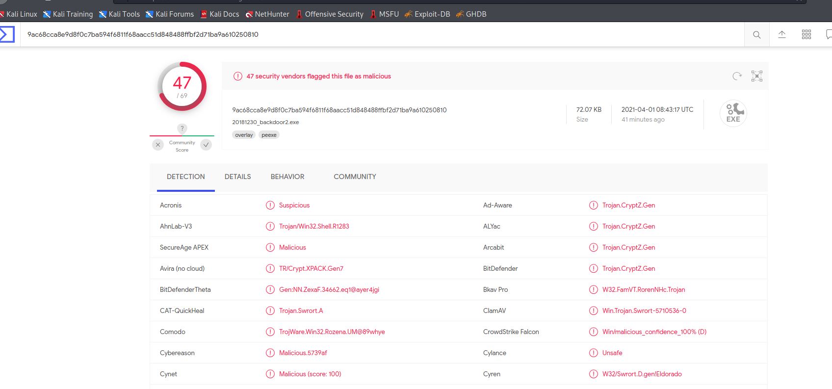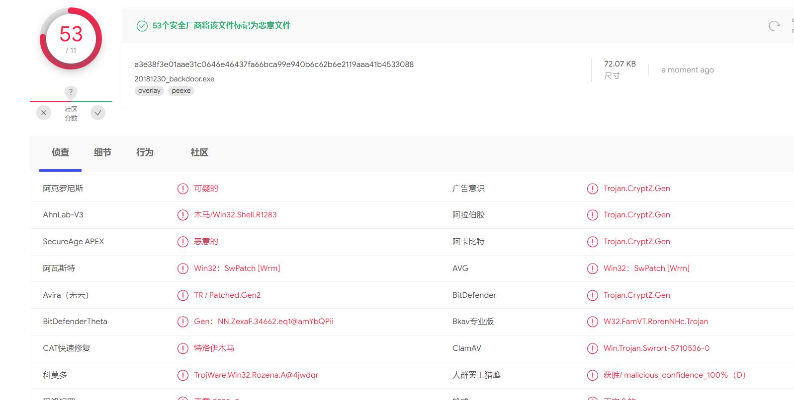 将实验二中用msf命令生成的后门程序20181230_backdoor.exe放到VirusTotal中扫描结果如下:
