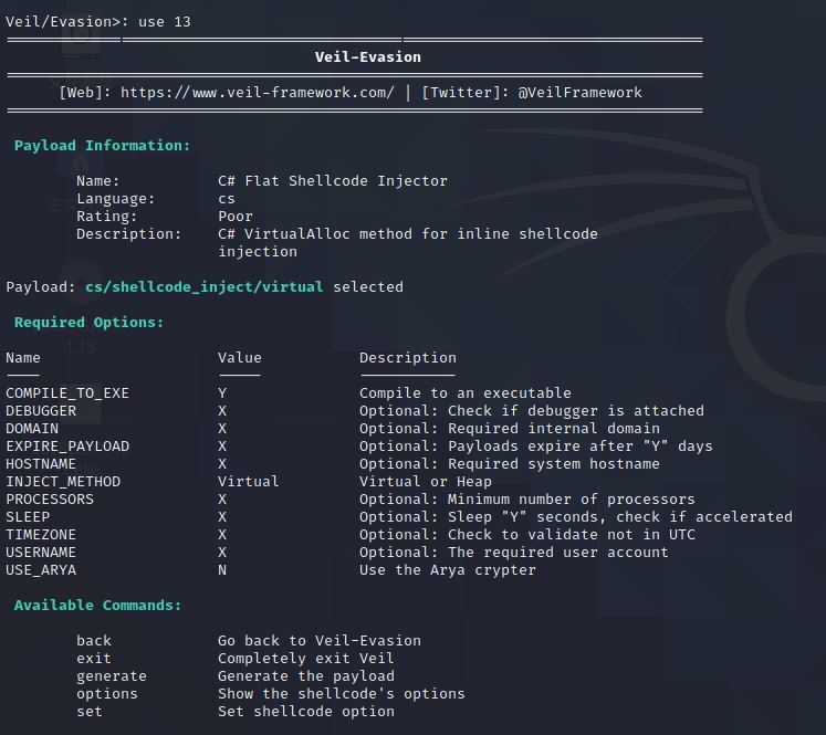 输入命令use 13,这里我选择的是第13个载荷cs/shellcode_inject/virtual.py