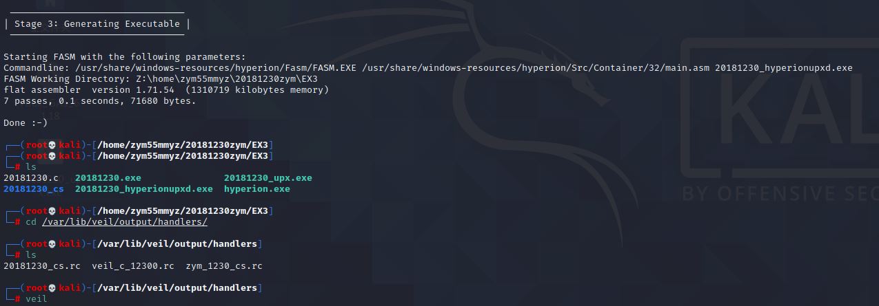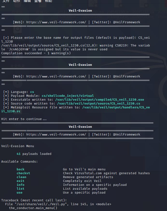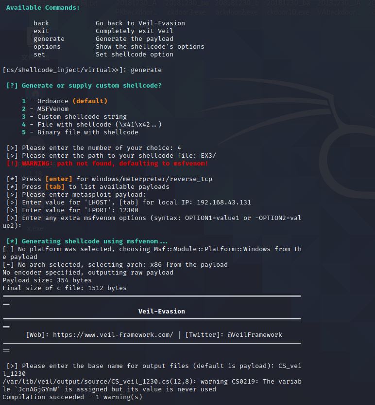 成功完成以上编译后,编译后的文件被保存在/var/lib/veil/output/compiled/cs_Veil_12300.exe下