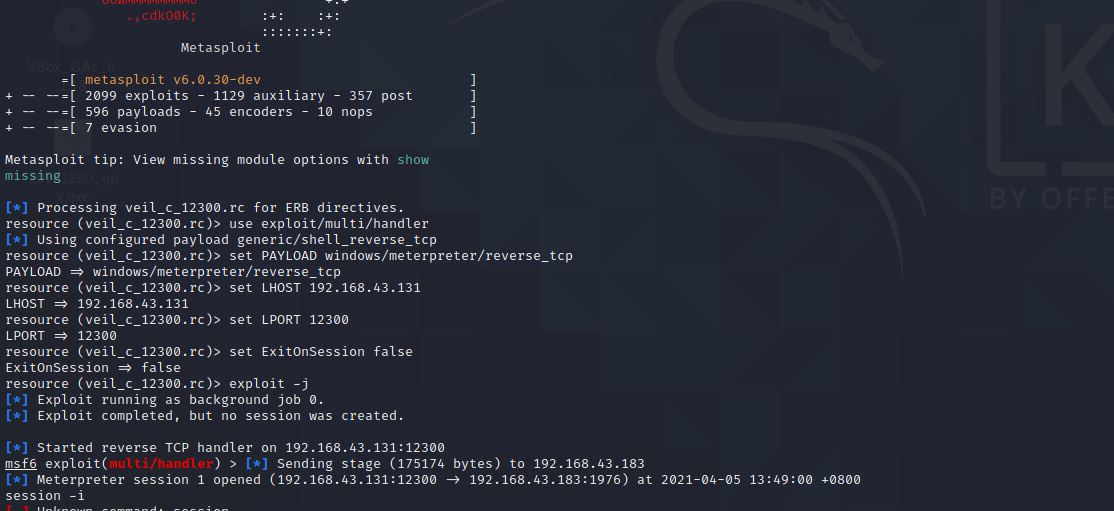 同时新生成的 shellcode 的 rc 文件也被保存在了 /var/lib/veil/output/handlers/cs_Veil_12300.rc下!既然有了rc文件,那么我们就可以方便的利用MSF 行调用了