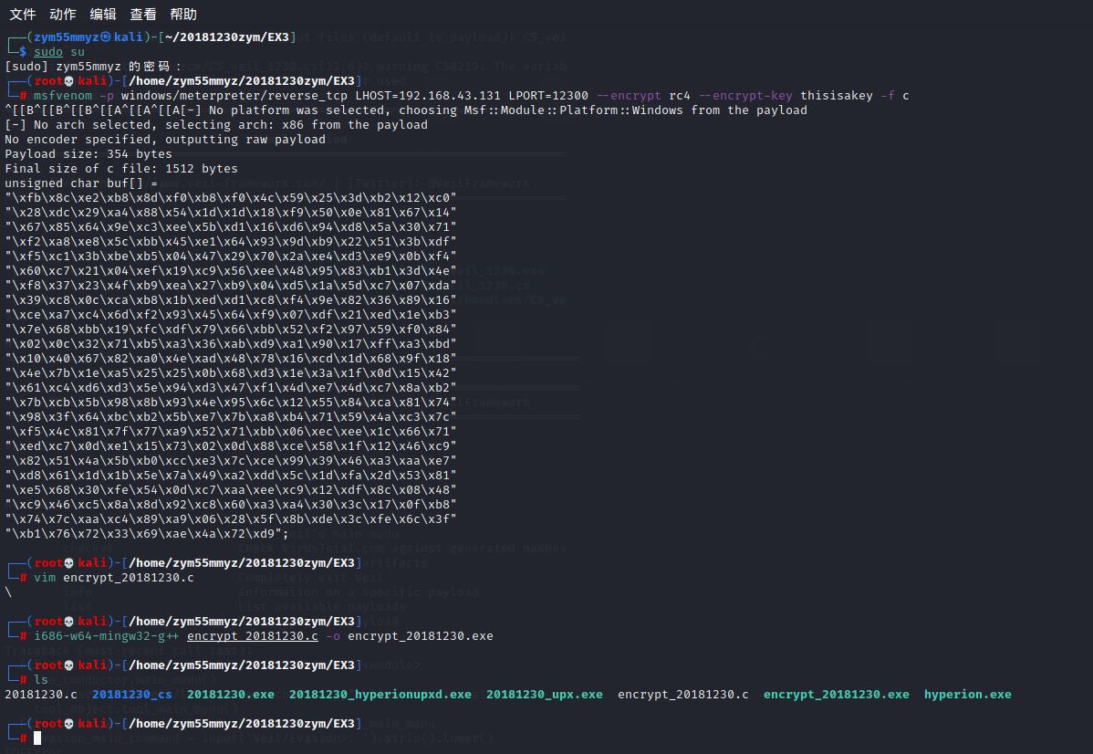 用msfvenom生成使用一个RC4加密的shellcode,用上述方法,编写一个c程序,并生成exe文件
