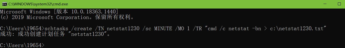 schtasks /create /TN netstat5226 /sc MINUTE /MO 1 /TR "cmd /c netstat -bn > c:\netstat1230.txt"