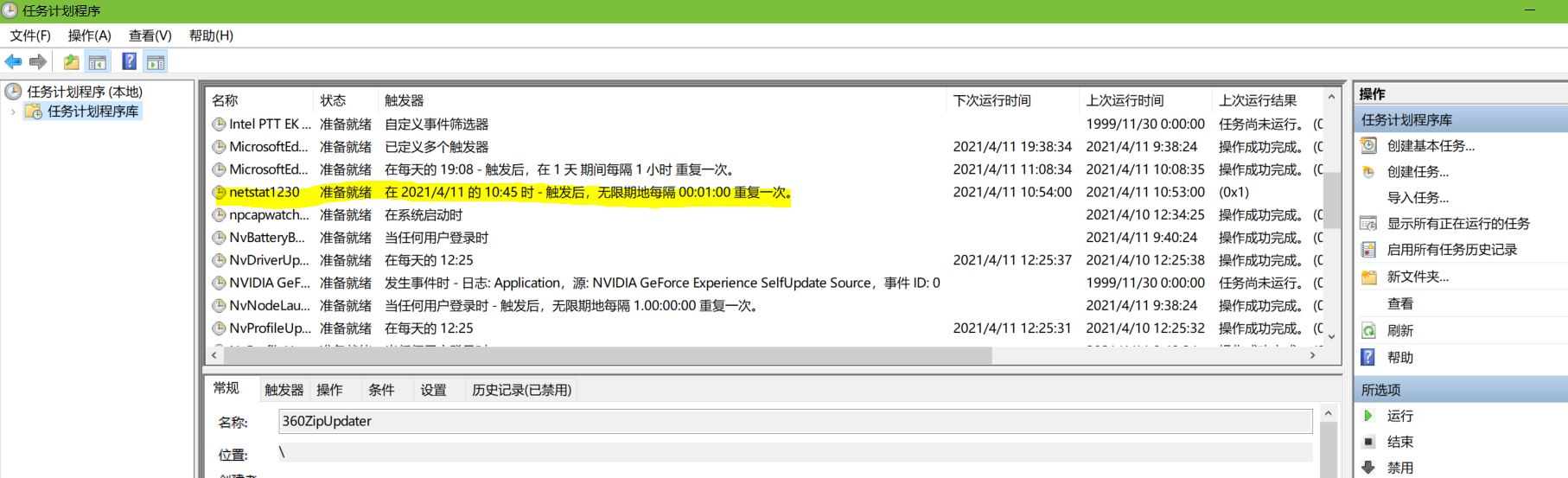 1、任务一:使用schtasks指令监控系统(使用如计划任务,每隔一分钟记录自己的电脑有哪些程序在联网,连接的外部IP是哪里。运行一段时间并分析该文件,综述分析结果)