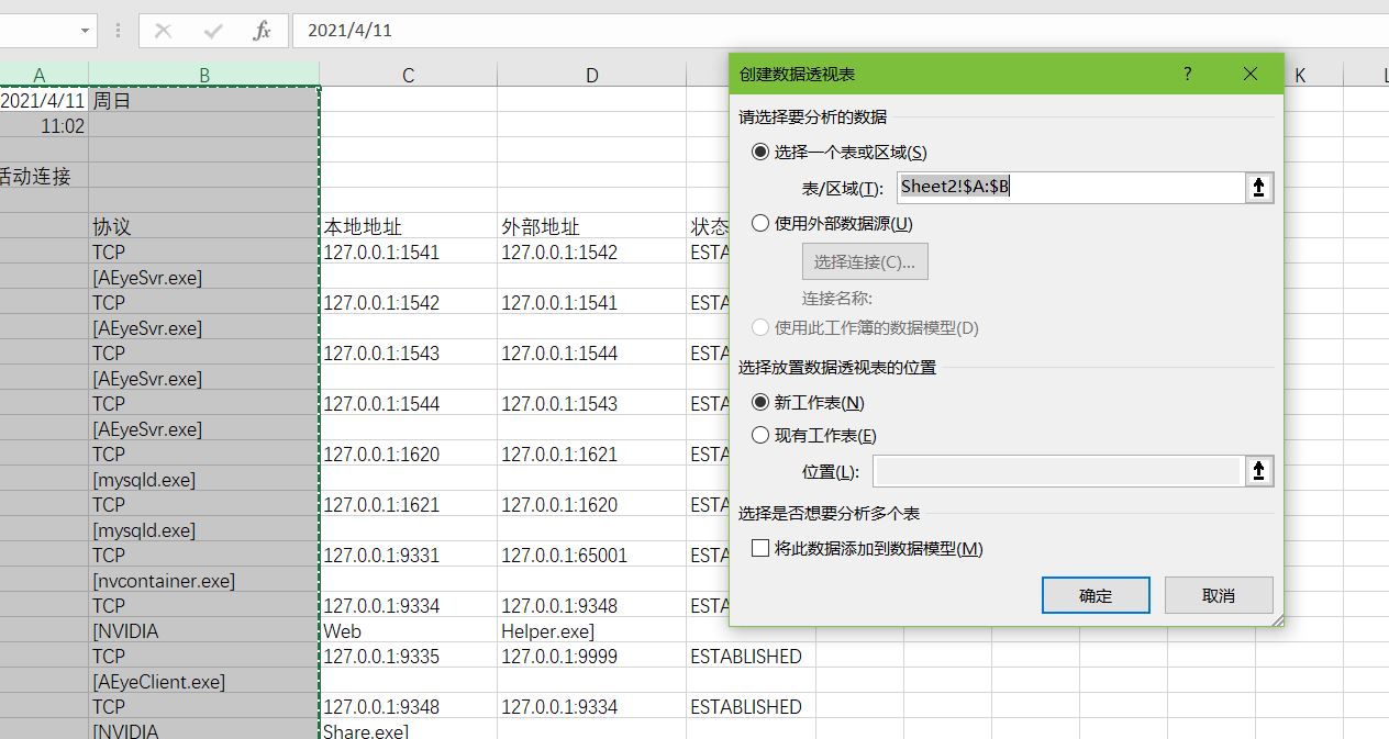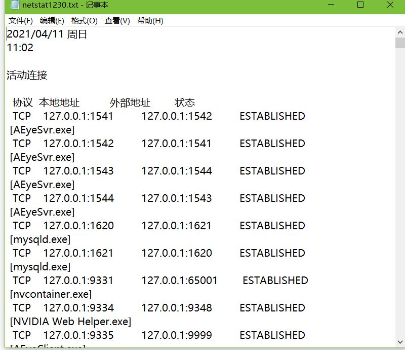 - TR "cmd /c netstat -bn:cmd运行指令"netstat -bn",b会显示可执行文件名