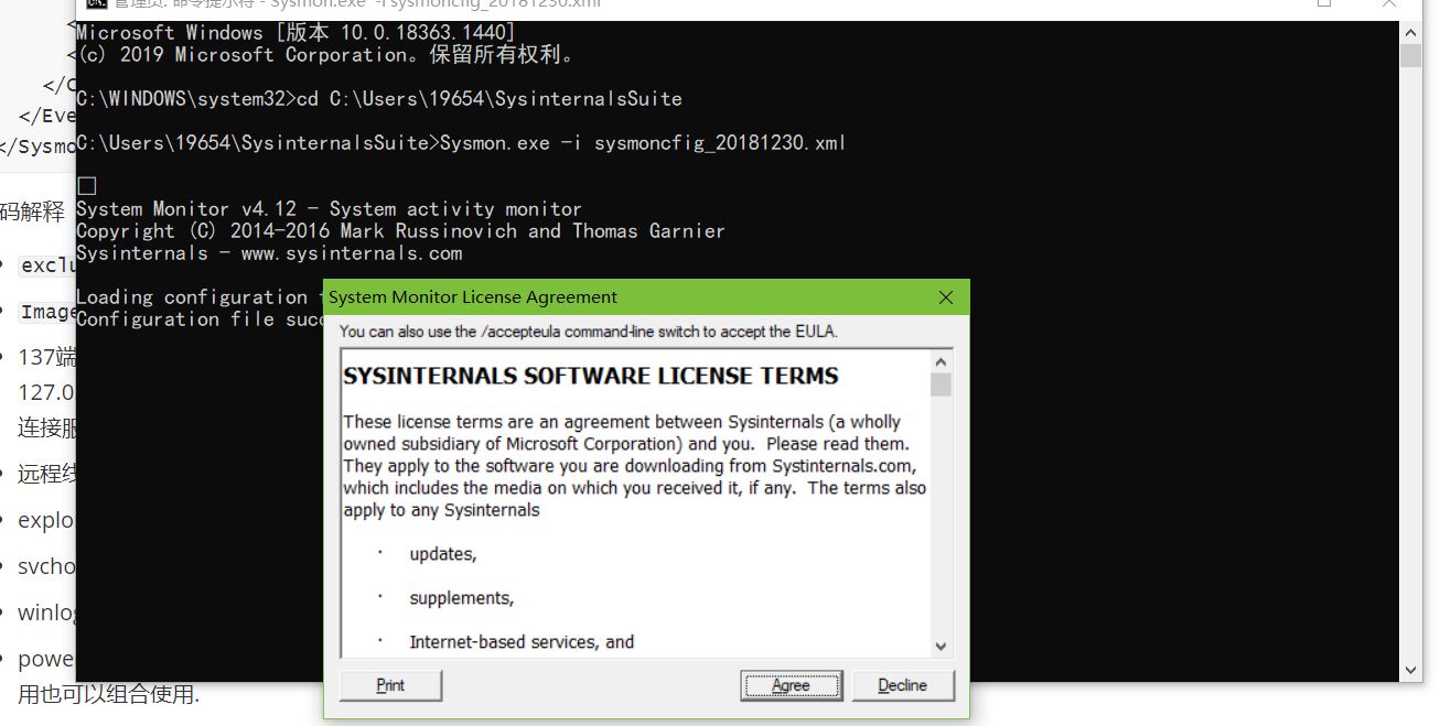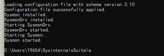 打开cmd,进入sysmon所在的文件夹,输入Sysmon.exe -i sysmoncfig_20181230.xml。