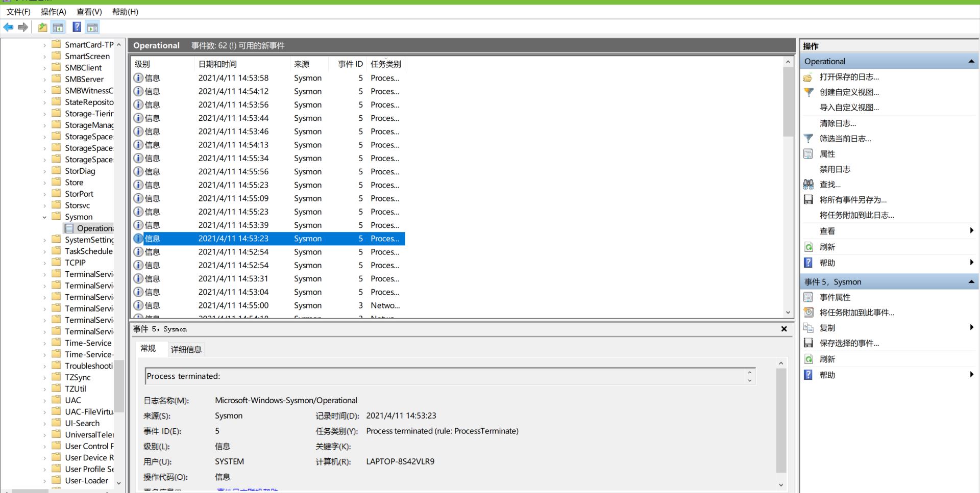 在事件查看器中进入应用程序和服务日志/Microsoft/Windows/Sysmon/Operational便可看到按我们编写的文档进行记录的事件