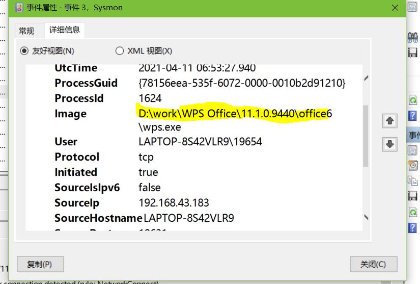 利用Sysmon就可以具体分析你主机最近的程序使用,如图就是分析了WPS Office,可以看到显示得有具体时间、运行的程序、使用的协议、源IP、目的IP等等.