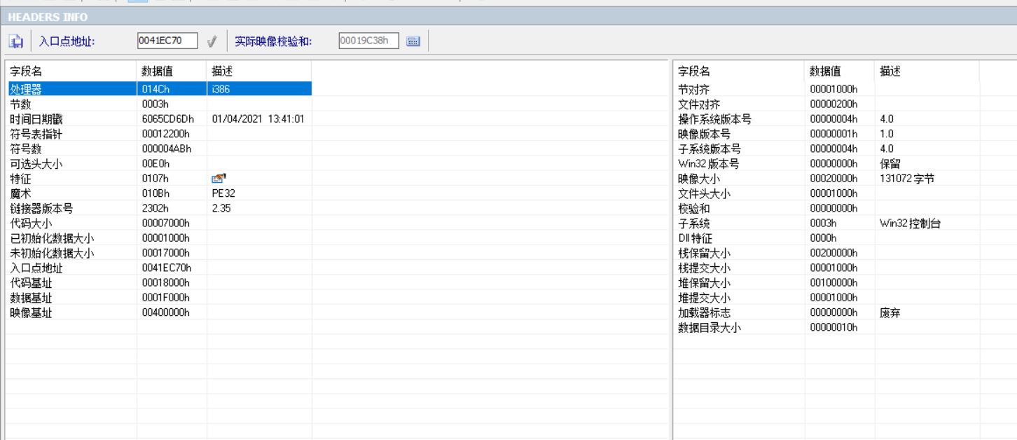 下载安装完成后,打开实验二创建的后门程序,可以看到其头部信息。