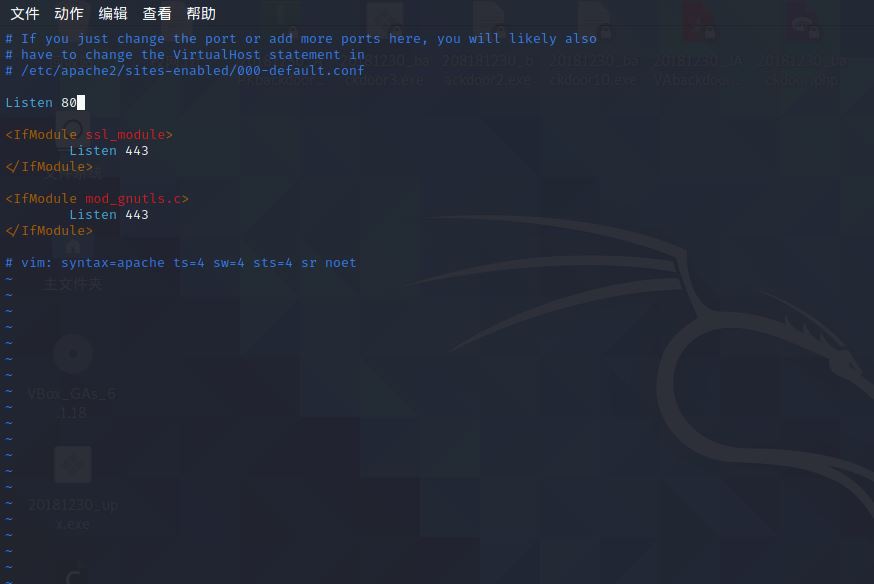 1、由于要将钓鱼网站挂在本机的http服务下,所以需要将SET工具的访问端口改为默认的80端口。使用sudo vi /etc/apache2/ports.conf命令修改Apache的端口文件,将端口改为80,如下图所示: