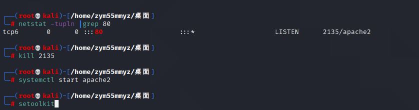 2、在kali中使用netstat -tupln |grep 80命令查看80端口是否被占用。如果有,使用kill+进程号杀死该进程: