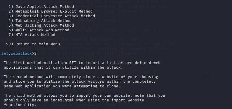 5、选择3:Credential Harvester Attack Method即登录密码截取攻击