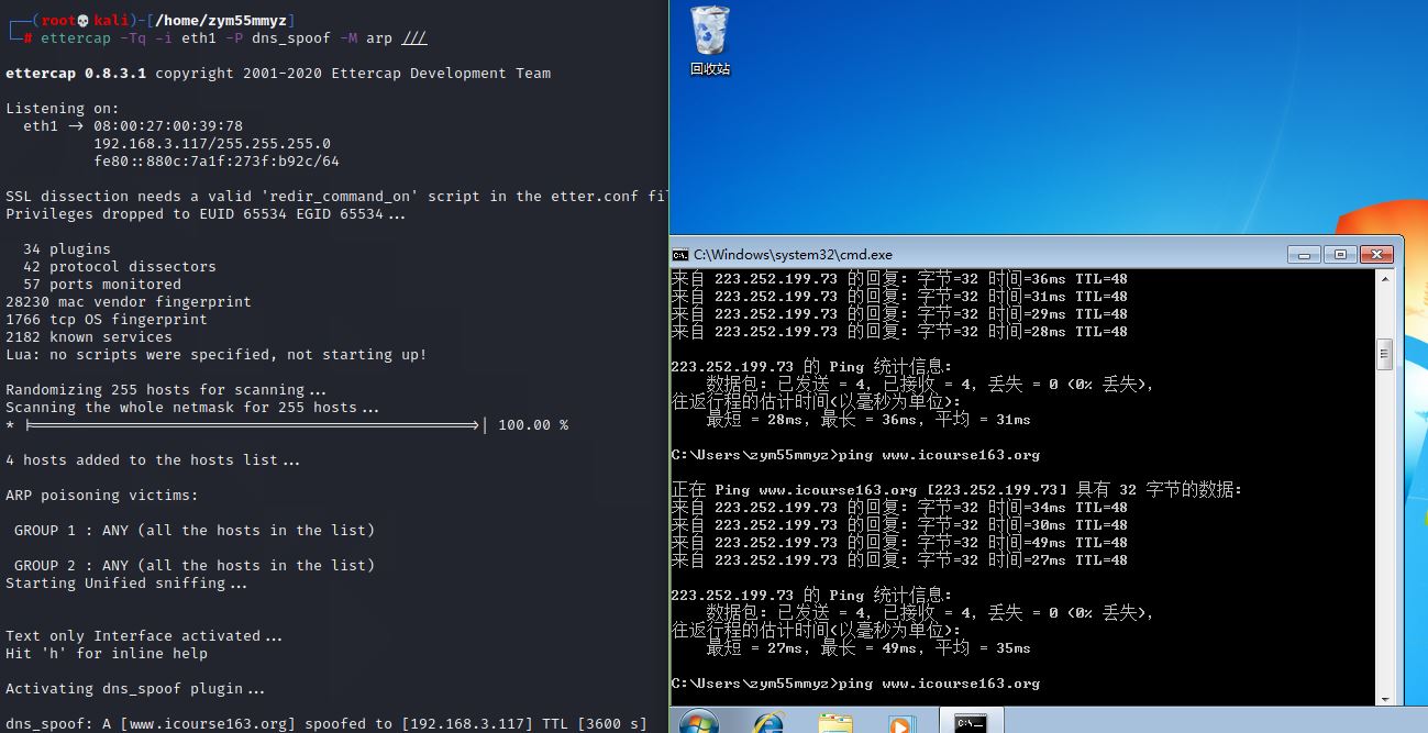 靶机ping教务网,显示的地址为攻击机的ip,攻击机检测到数据.不过再重新ping攻击机这边就接收不到了,应该是使用靶机使用自己的缓存表了