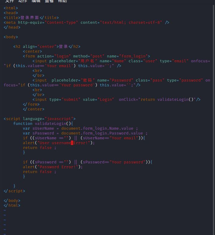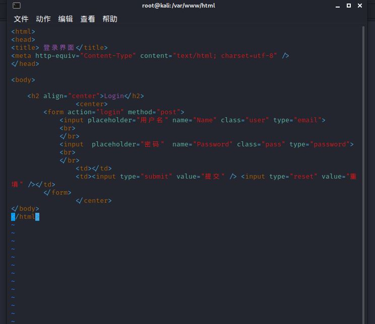 3、使用cd /var/www/html进入Apache目录下,新建一个简单的含有表单的html文件login_form.html,内容如下: