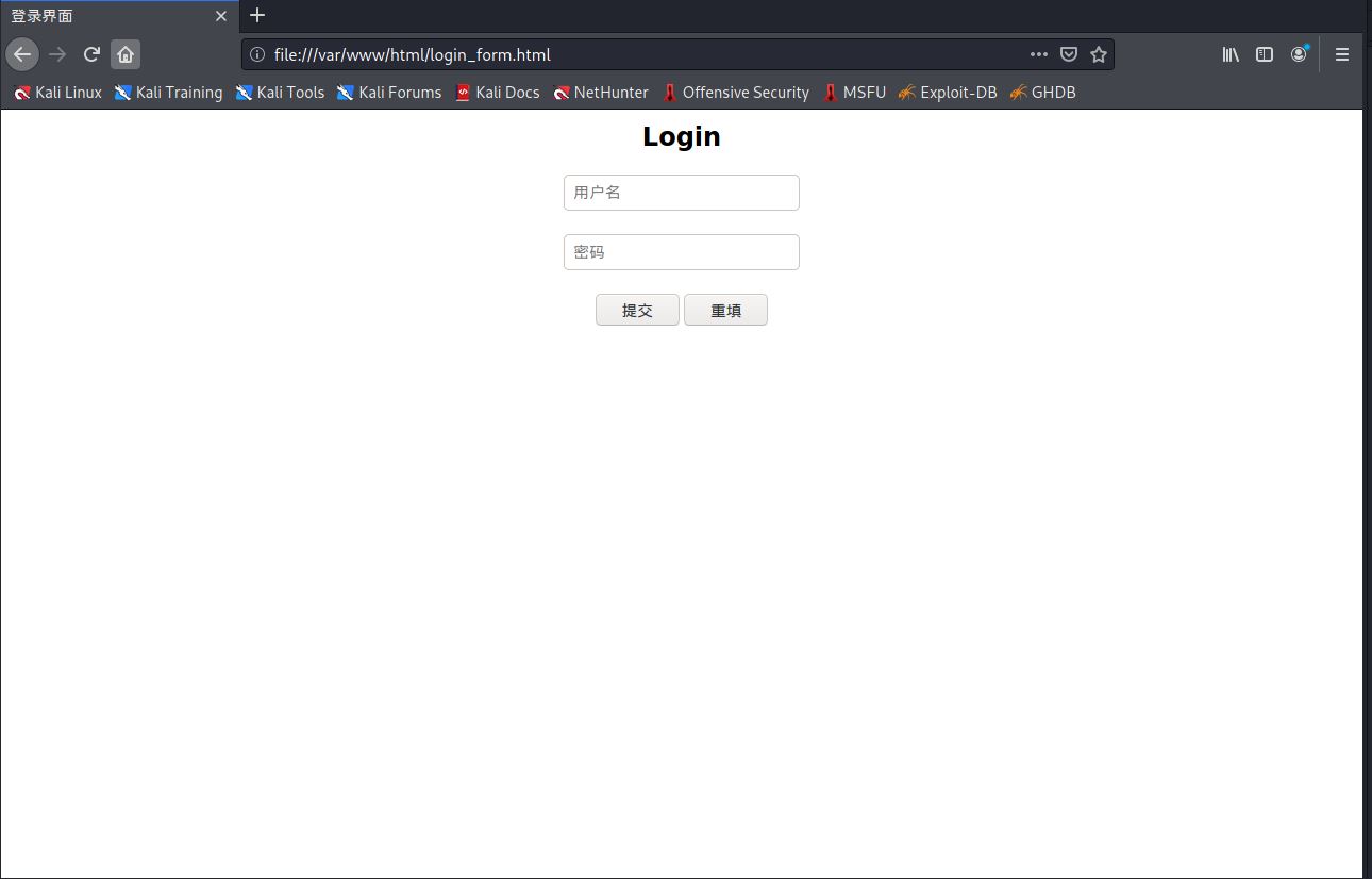 4、在浏览器中输入/var/www/html/login_form.html打开网页如下所示: